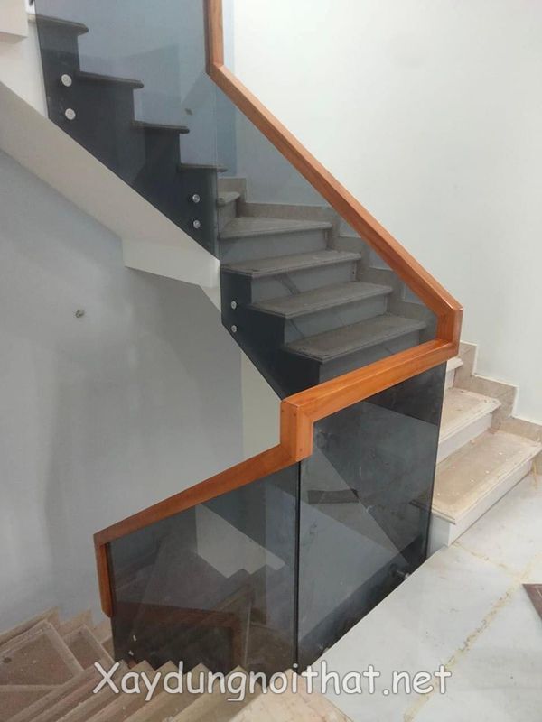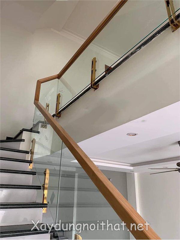 Kỹ thuật liên kết tay vịn gỗ và vách kính cường lực: Phần tay vịn gỗ được sập trực tiếp lên cạnh kính hoặc qua hệ thống bát liên kết inox 304 cao cấp.
